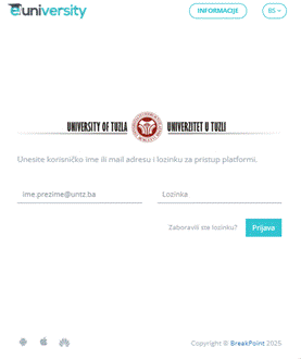 Prijavu na eUniversity platformu studenti vrše putem web servisa na adresi e.untz.ba a kao pristupne podatke koriste prethodno dodijeljeni Google Worspace e-mail nalog (ime.prezime@untz.ba) i inicijalnu korisničku šifru. Pristupnu korisničku šifru za studenta studentska služba može generisati prilikom kreiranja korisničkog naloga na eUniversity platformi pomoću opcije predviđene za tu akciju a čime se onda studentu putem Google Worspace e-maila u njegov inbox dostavljaju pristupni podaci za eUniversity platformu. Ukoliko pristupni podaci nisu generisani u inbox e-maila prilikom kreiranja studentskog naloga, studentska služba će studentima generisati inicijalne pristupne podatke iz eUniversity platforme i iste predati u štampanoj formi.